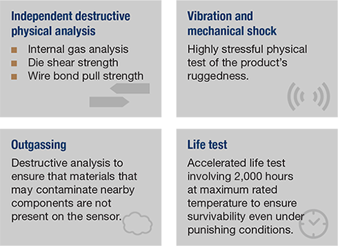 - Sensors are exposed to one week of continuous operation at elevated temperatures, then exposed to 100 thermal shocks between room temperature and liquid nitrogen (77.35 K) to weed out early-life failures